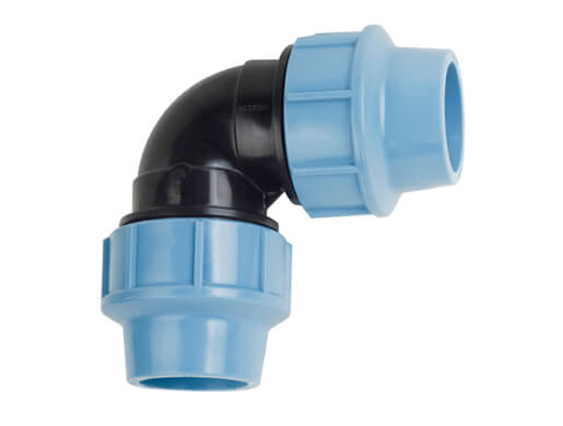 PP compression fittings 90°elbow is designed to connect the plastic pipe to another at a 90°angle.The mechanical connection can be done easily and quickly without glue or butt fusion.